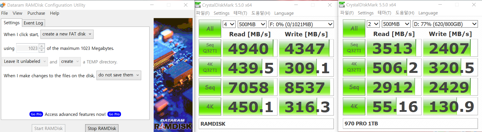 설명처럼 좌측의 결과는 Ramdisk이고, 우측은 970 PRO 1TB (NVMe PCIe x4) 이다.