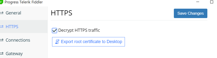 ”Export root certificate to Desktop” 버튼을 누르게 되면 사용자의 컴퓨터에 Fiddler의 인증서를 신뢰할 수 있도록 저장시킨다.