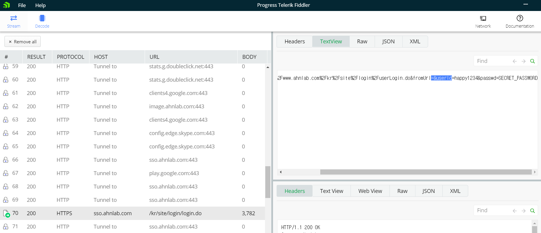 2. Progress Telerik Fiddler 으로 HTTPS Decode옵션을 켜놓고 로그인 시도시