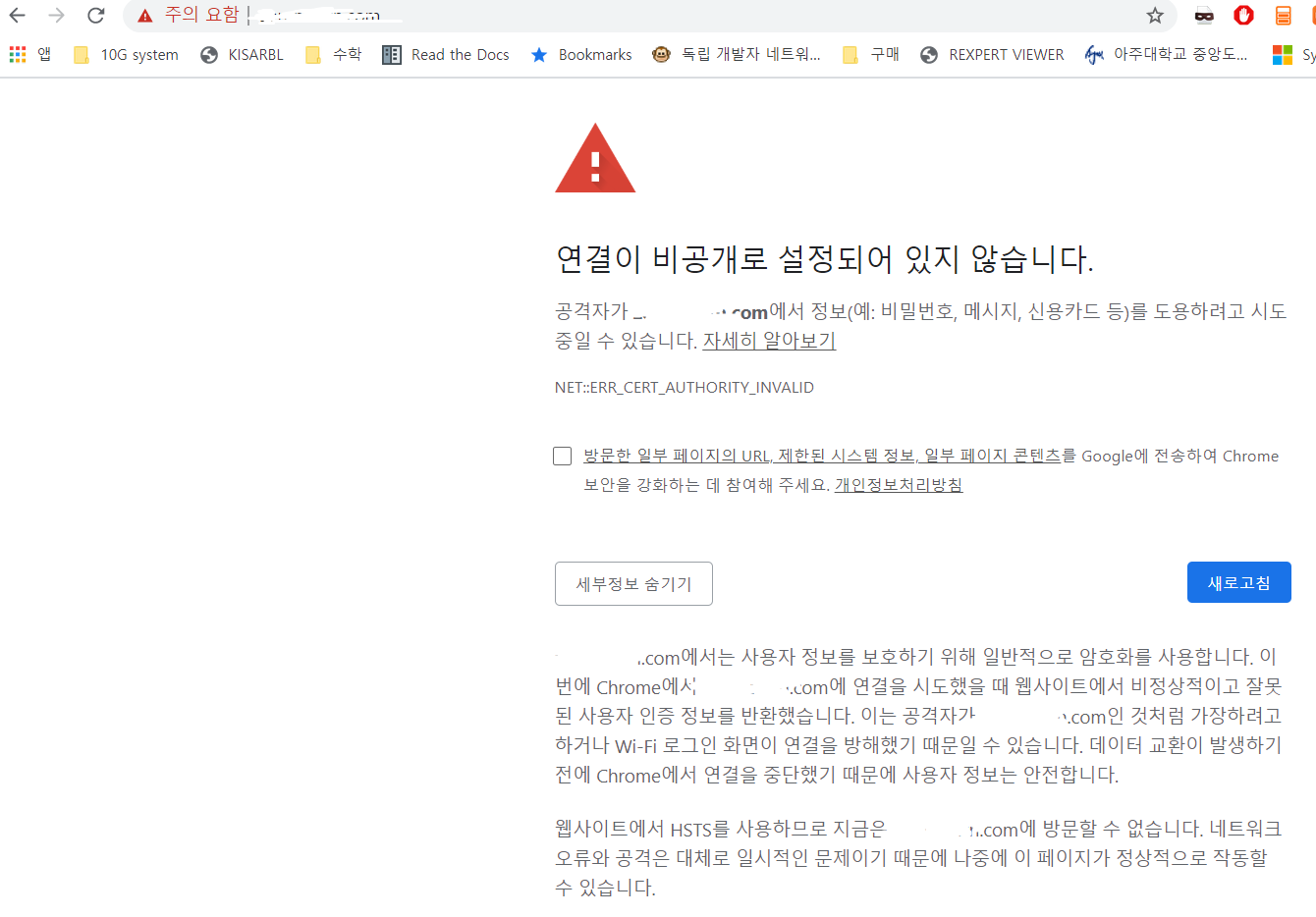 이러한 일 또한 방지하기 위해서는 HSTS(HTTP Strict Transport Security)을 사용해야 한다. 이는 한번 이상 정상적인 방법으로 웹사이트에 접근했을 경우 브라우저가 서버 인증서를 저장하고 유지하도록 하여 이후 MITM공격이 발생하였을 때 아래 사진과 같이 더 이상 다음 과정으로 진행하지 못하게 막는 기능이다.